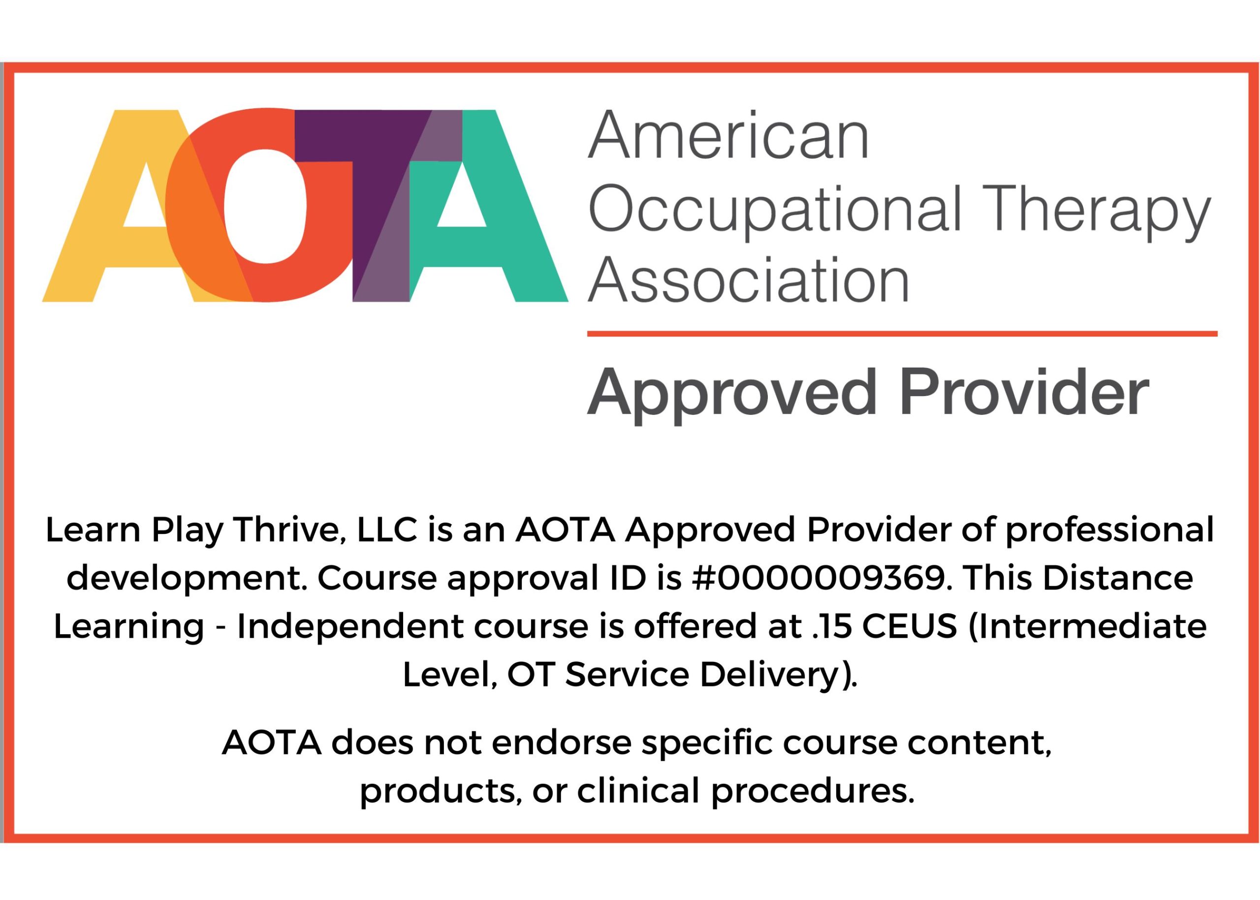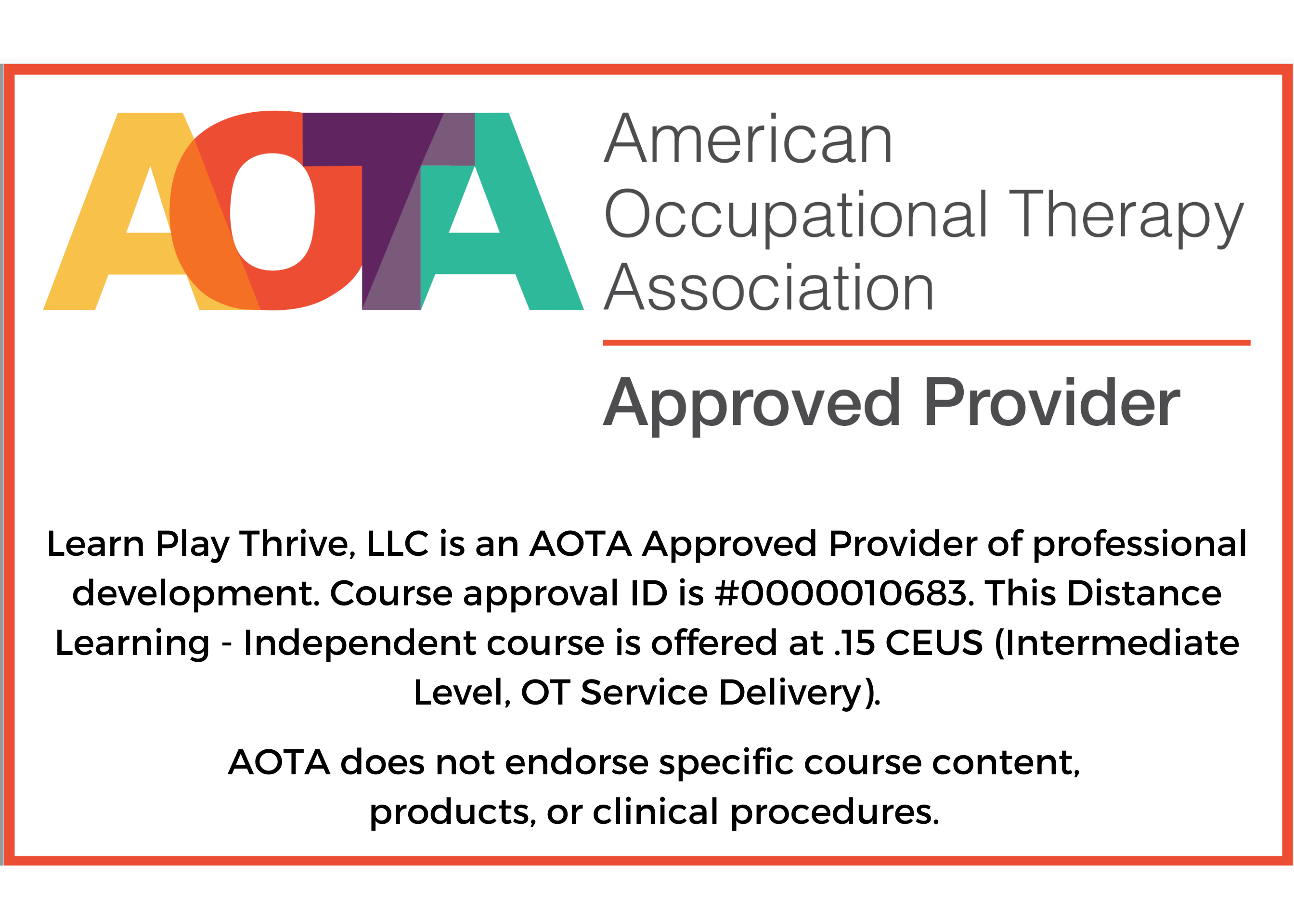 The recorded materials in these courses were last updated January 2024. This course is available for ASHA CEUs starting January 10th, 2024 until January 9th, 2029. ASHA CE Provider approval and use of the Brand Block does not imply endorsement of course content, specific products or clinical procedures. The assignment of AOTA CEUs does not imply endorsement of specific course content, products, or clinical procedures by AOTA. Learn Play Thrive is approved by the National Association of School Psychologists to provide continuing education for psychologists. Learn Play Thrive maintains responsibility for the program and its content. NASP Approved Provider # 1172.